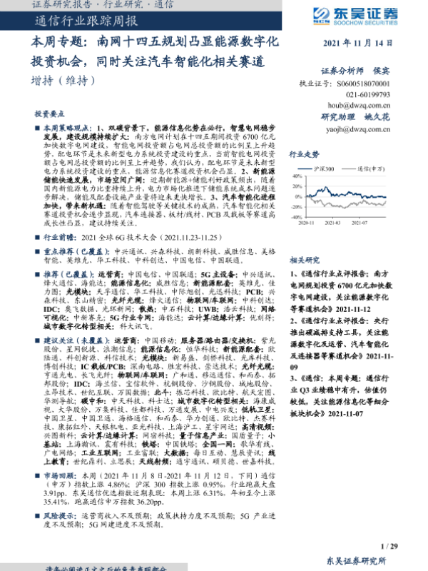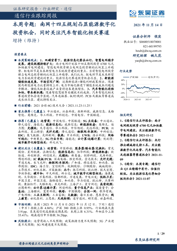 【东吴证券】【20211114】通信行业跟踪周报:本周专题:南网十四五规划凸显能源数字化投资机会,同时关注汽车智能化相关赛道-29页