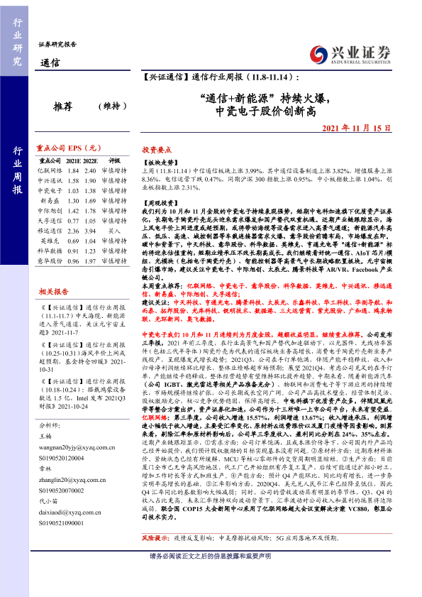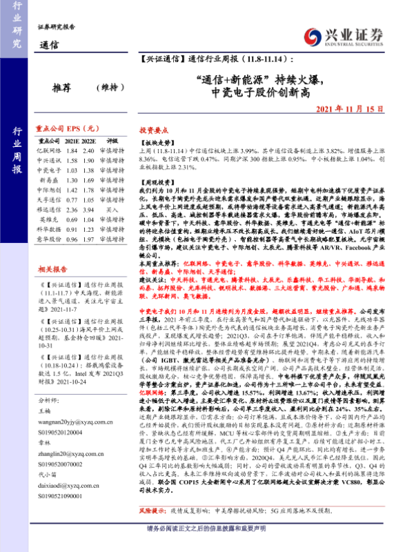 【兴业证券】【20211115】【兴证通信】通信行业周报(11.8-11.14):“通信+新能源”持续火爆,中瓷电子股价创新高-25页