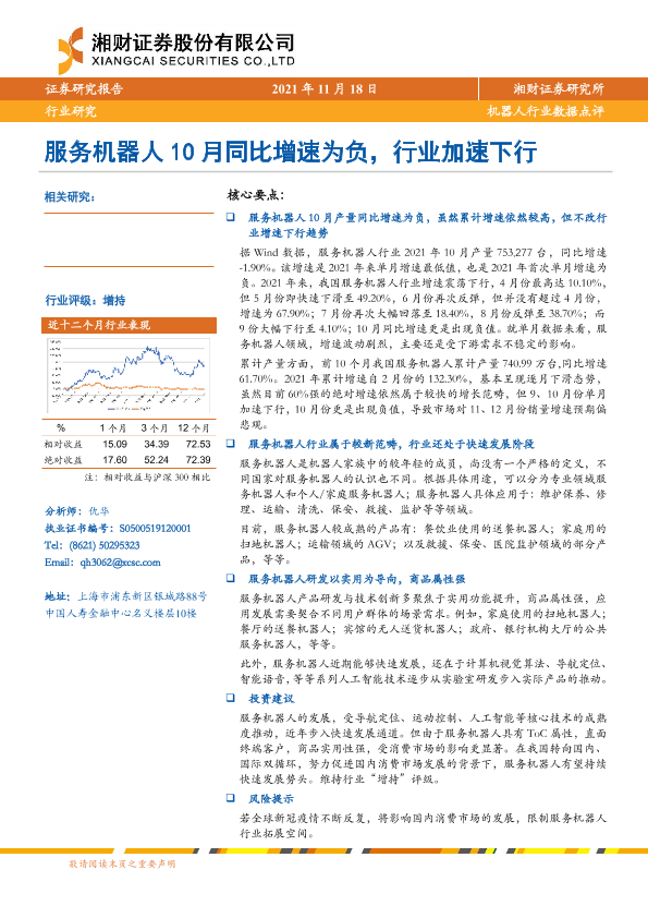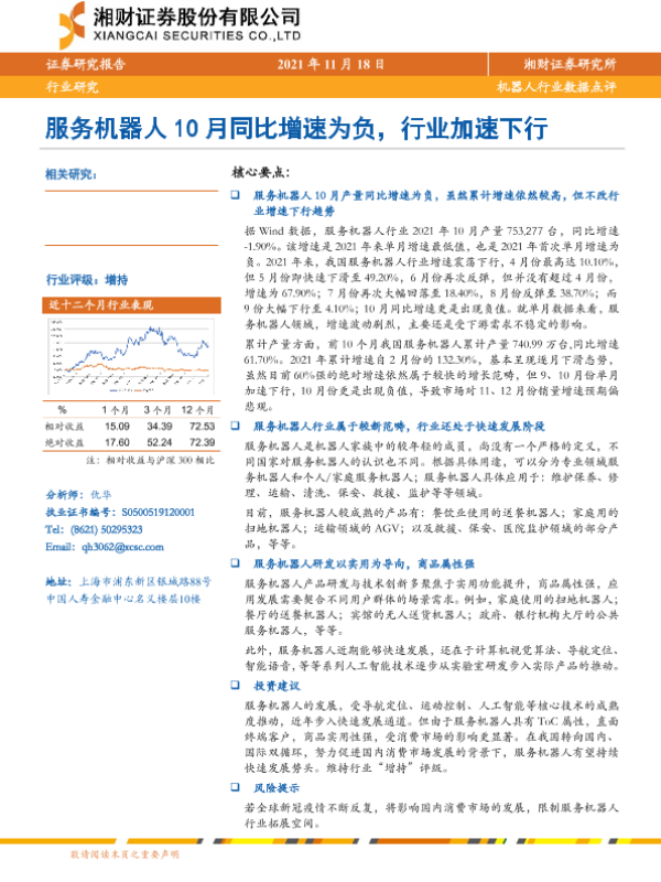 【湘财证券】【20211118】机器人行业数据点评:服务机器人10月同比增速为负,行业加速下行-4页