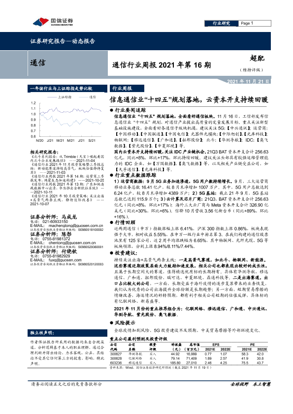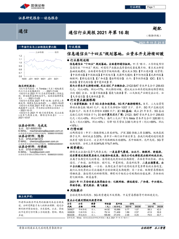 【国信证券】【20211121】通信行业周报2021年第16期:信息通信业“十四五”规划落地,云资本开支持续回暖-21页
