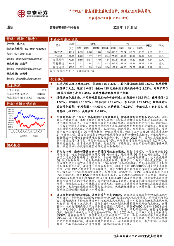 【中泰证券】【20211121】中泰通信行业周报:“十四五”信息通信发展规划出炉,海缆行业维持高景气-15页