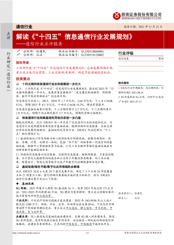 【浙商证券】【20211121】20211121-浙商证券-通信行业点评报告:解读《“十四五”信息通信行业发展规划》-4页
