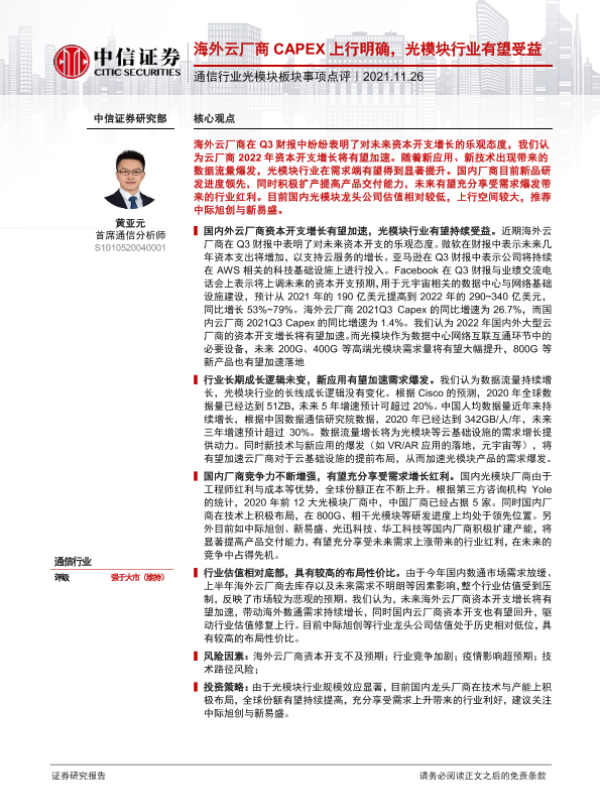 【中信证券】【20211126】通信行业光模块板块事项点评:海外云厂商CAPEX上行明确,光模块行业有望受益-5页