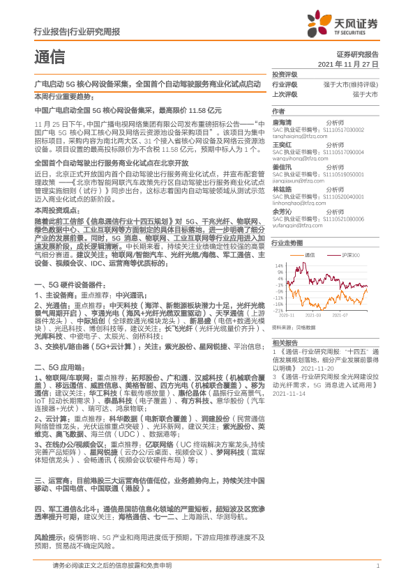 【天风证券】【20211127】通信行业研究周报:广电启动5G核心网设备采集,全国首个自动驾驶服务商业化试点启动-15页