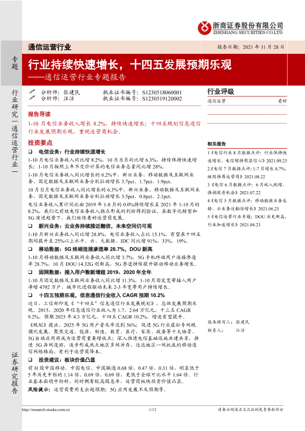 【浙商证券】【20211128】通信运营行业专题报告:行业持续快速增长,十四五发展预期乐观-12页