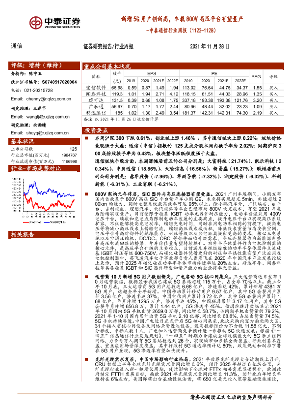 【中泰证券】【20211128】中泰通信行业周报:新增5G用户创新高,车载800V高压平台有望量产-12页