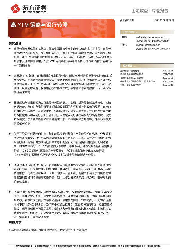 【东方证券】【20220929】高YTM策略与银行转债-15页