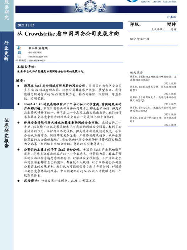 【国泰君安证券】【20211202】从Crowdstrike看中国网安公司发展方向-7页