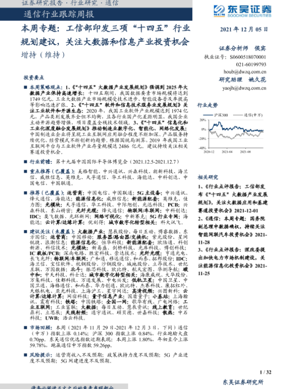 【东吴证券】【20211205】通信行业跟踪周报:本周专题:工信部印发三项“十四五”行业规划建议,关注大数据和信息产业投资机会-32页