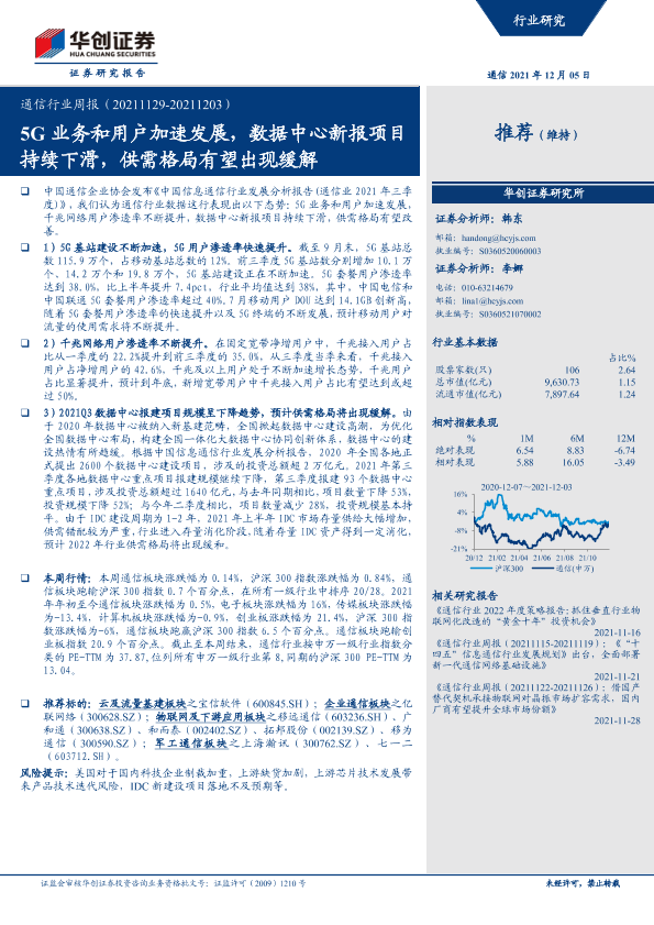 【华创证券】【20211205】通信行业周报:5G业务和用户加速发展,数据中心新报项目持续下滑,供需格局有望出现缓解-18页