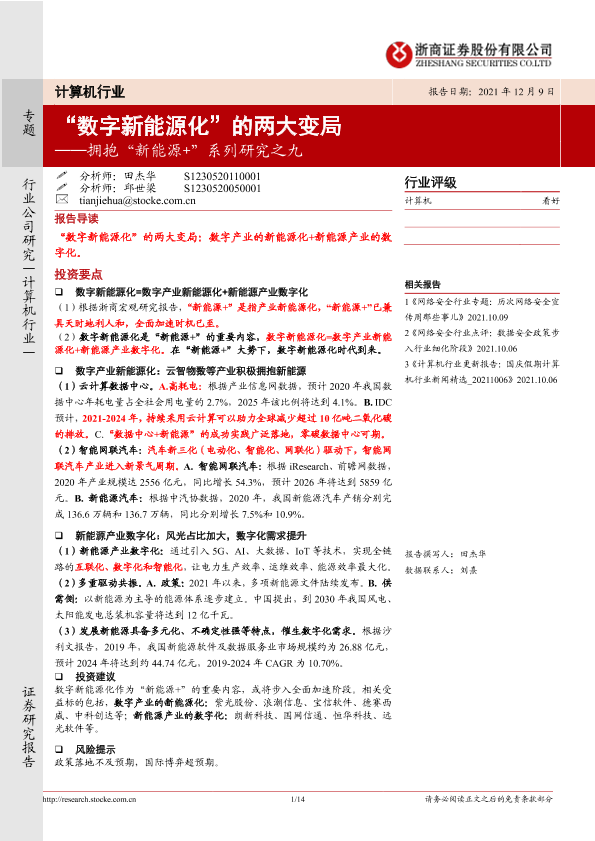 【浙商证券】【20211209】计算机行业拥抱“新能源+”系列研究之九:“数字新能源化”的两大变局-14页