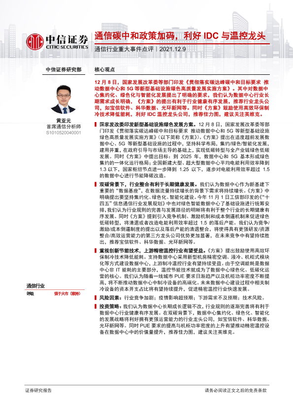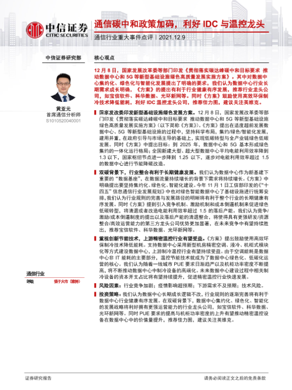 【中信证券】【20211209】通信行业重大事件点评:通信碳中和政策加码,利好IDC与温控龙头-4页
