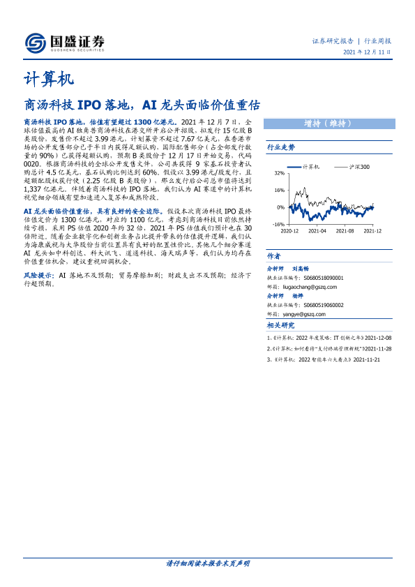 【国盛证券】【20211211】20211211-国盛证券-计算机行业周报:商汤科技IPO落地,AI龙头面临价值重估-9页