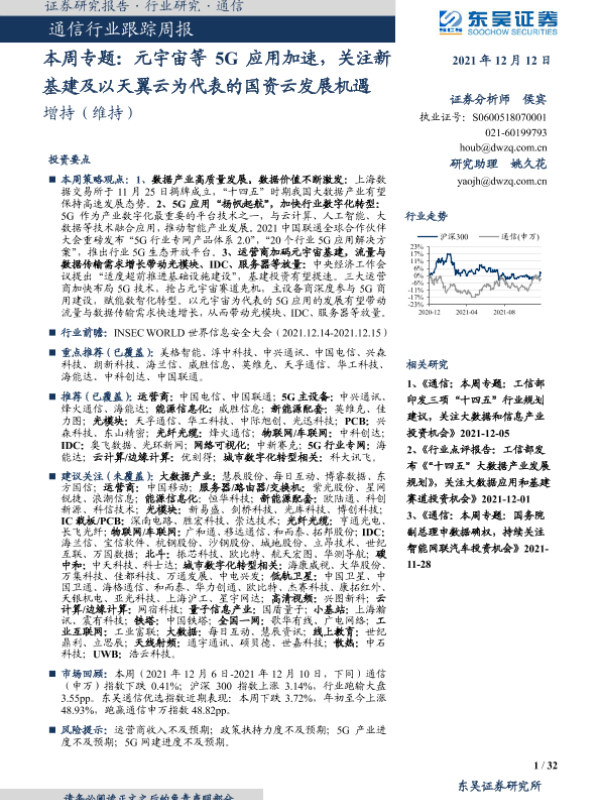 【东吴证券】【20211212】20211212-东吴证券-通信行业跟踪周报:本周专题:元宇宙等5G应用加速,关注新基建及以天翼云为代表的国资云发展机遇-32页