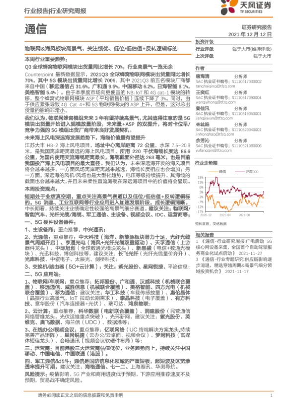 【天风证券】【20211212】20211212-天风证券-通信行业研究周报:物联网&海风板块高景气,关注绩优、低位低估值+反转逻辑标的-15页