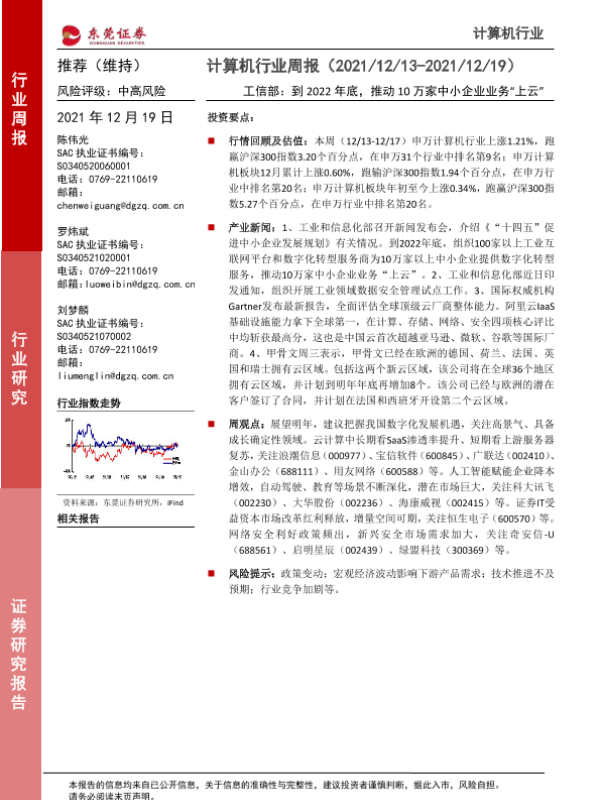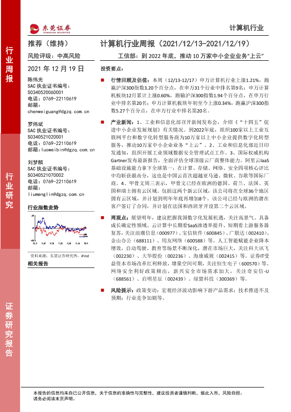 【东莞证券】【20211219】计算机行业周报:工信部:到2022年底,推动10万家中小企业业务“上云”-8页