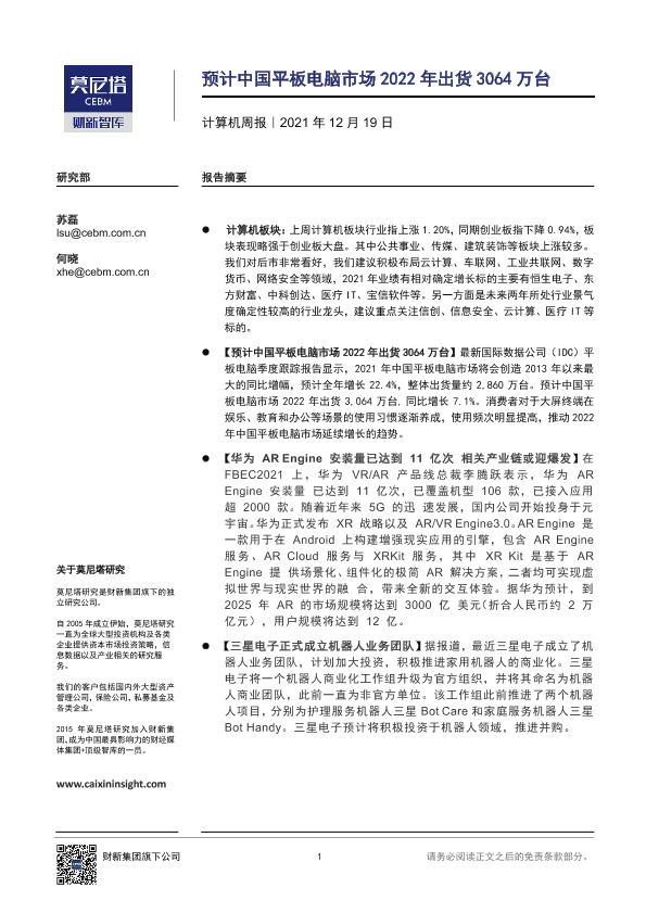 【莫尼塔研究】【20211219】20211219-莫尼塔投资-计算机周报:预计中国平板电脑市场2022年出货3064万台-7页