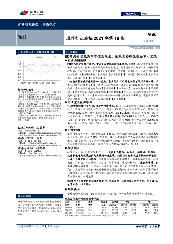 【国信证券】【20211219】通信行业周报2021年第18期:EDR提升智能汽车赛道景气度,政策支持绿色数据中心发展-22页