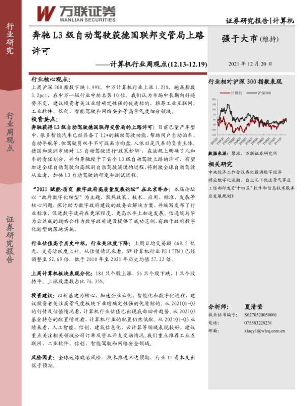 【万联证券】【20211220】计算机行业周观点:奔驰L3级自动驾驶获德国联邦交管局上路许可-11页