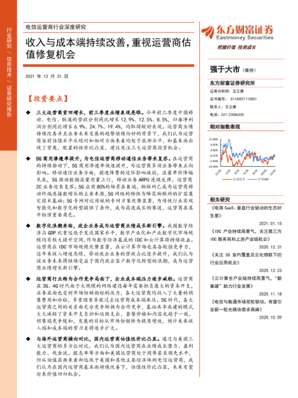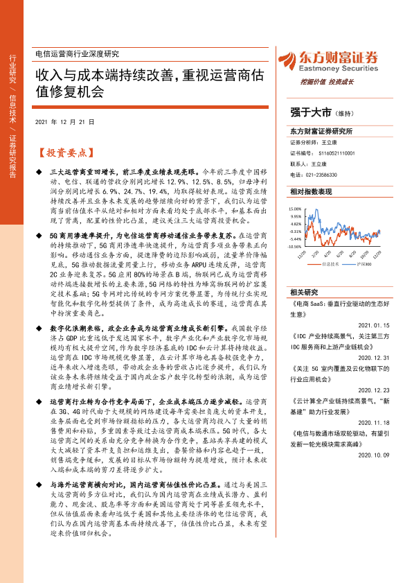 【东方财富证券】【20211221】电信运营商行业深度研究:收入与成本端持续改善,重视运营商估值修复机会-31页