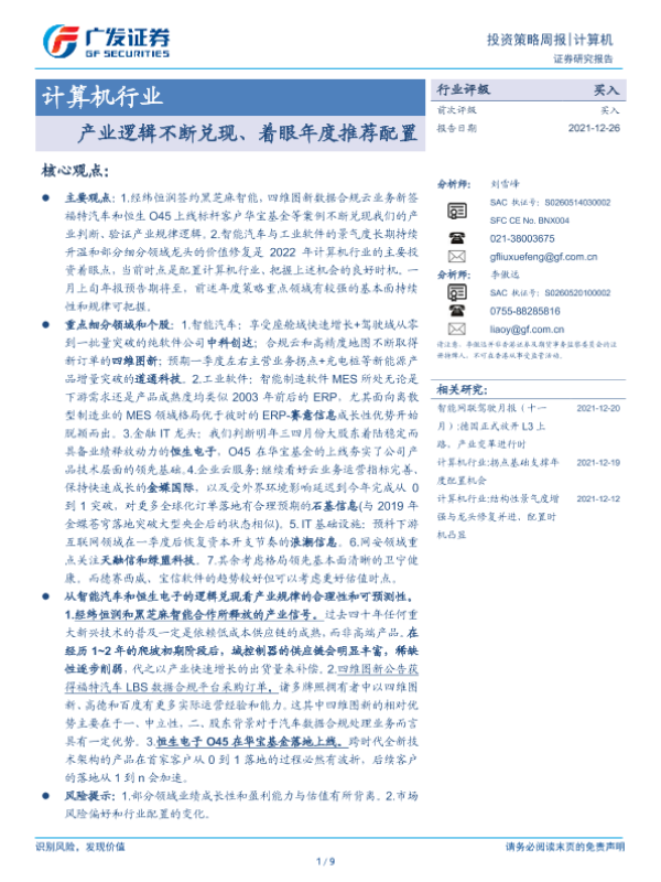 【广发证券】【20211226】20211226-广发证券-计算机行业投资策略周报:产业逻辑不断兑现、着眼年度推荐配置-9页