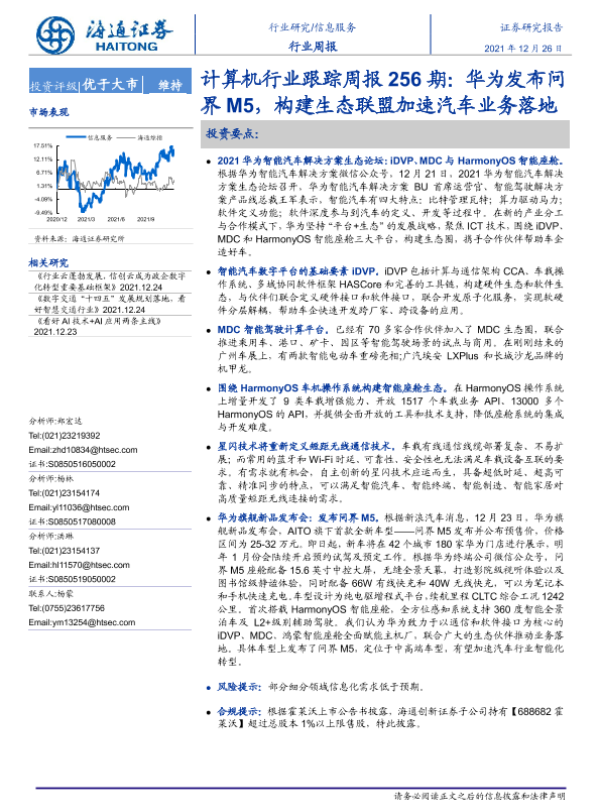 【海通证券】【20211226】计算机行业跟踪周报256期:华为发布问界M5,构建生态联盟加速汽车业务落地-4页