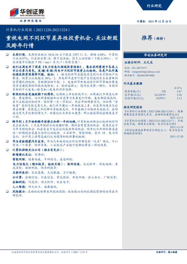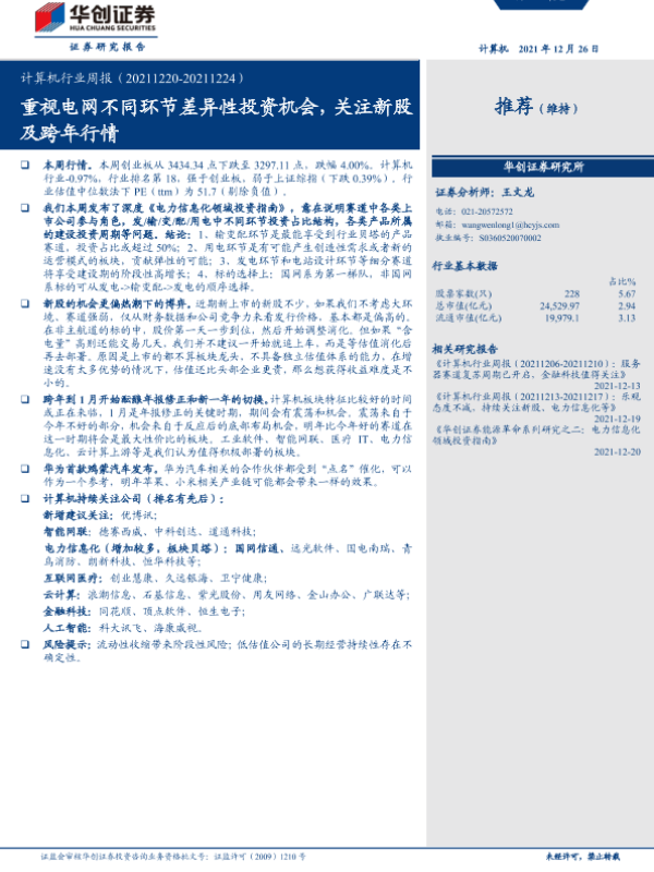 【华创证券】【20211226】20211226-华创证券-计算机行业周报:重视电网不同环节差异性投资机会,关注新股及跨年行情-4页