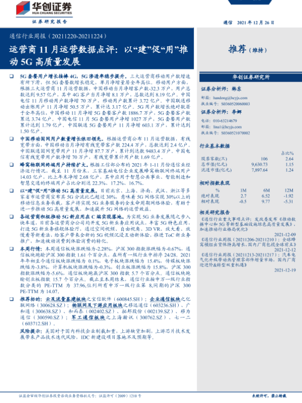 【华创证券】【20211226】通信行业周报:运营商11月运营数据点评:以“建”促“用”推动5G高质量发展-21页