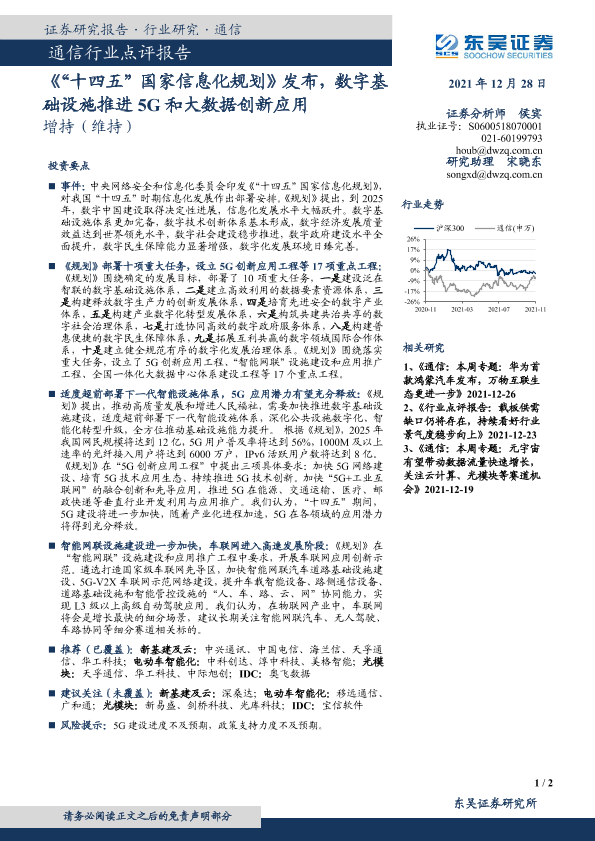 【东吴证券】【20211228】通信行业点评报告:《“十四五”国家信息化规划》发布,数字基础设施推进5G和大数据创新应用-2页