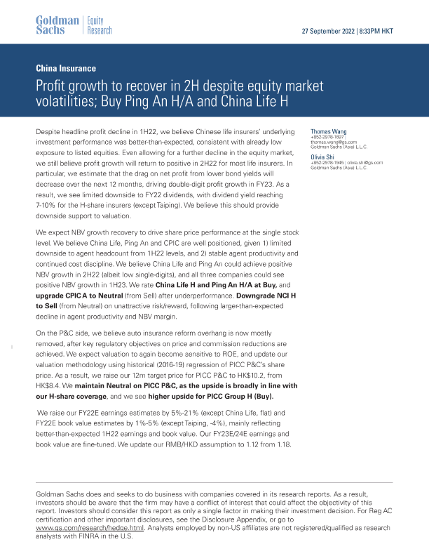 【Goldman Sachs】【20220927】Profit growth to recover in 2H despite equity market volatilities; Buy Ping An H/A and China Life H-30页