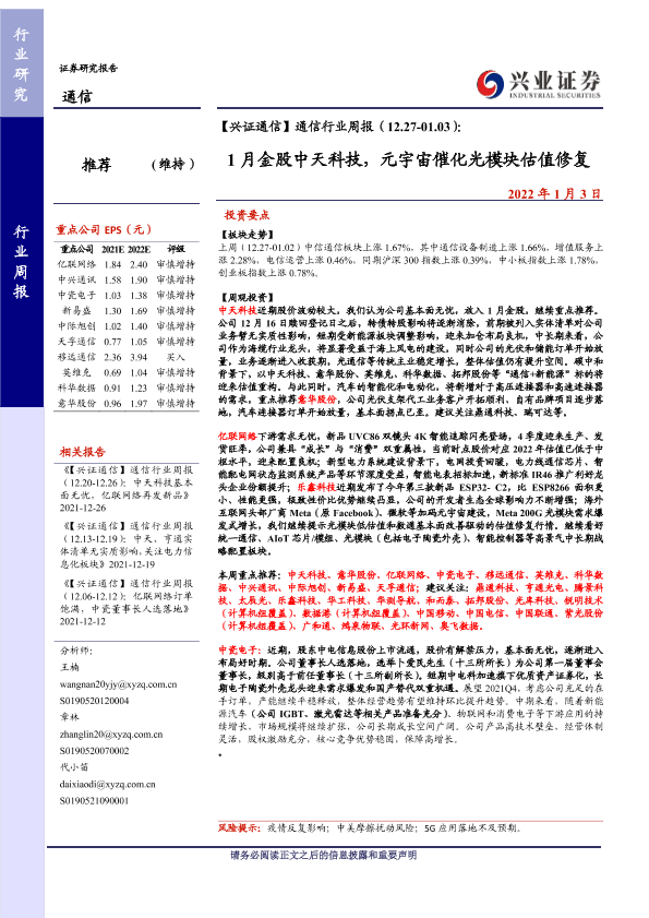 【兴业证券】【20220103】【兴证通信】通信行业周报(12.27-01.03):1月金股中天科技,元宇宙催化光模块估值修复-27页