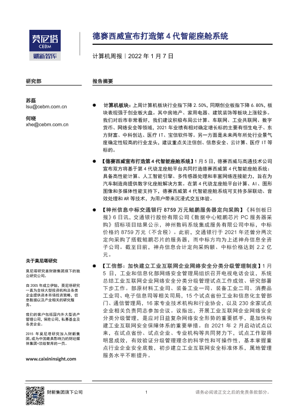 【莫尼塔研究】【20220107】20220107-莫尼塔投资-计算机周报:德赛西威宣布打造第4代智能座舱系统-7页