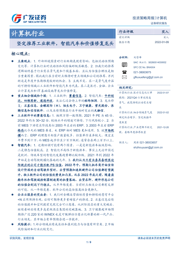 【广发证券】【20220109】20220109-广发证券-计算机行业投资策略周报:坚定推荐工业软件,智能汽车和价值修复龙头-9页