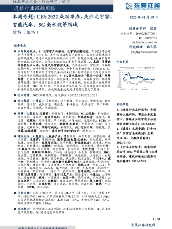 【东吴证券】【20220109】20220109-东吴证券-通信行业跟踪周报:本周专题:CES 2022成功举办,关注元宇宙、智能汽车、5G毫米波等领域-30页