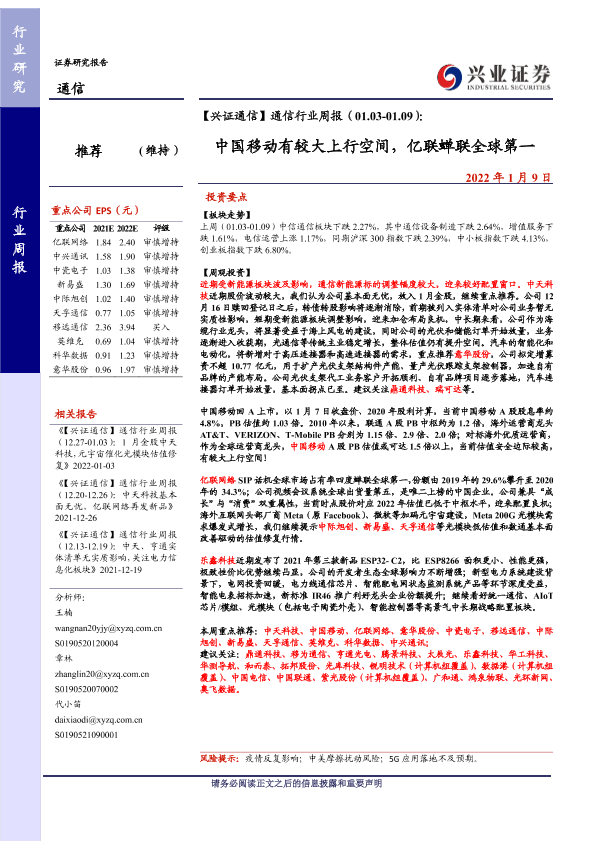 【兴业证券】【20220109】【兴证通信】通信行业周报(01.03-01.09):中国移动有较大上行空间,亿联蝉联全球第一-28页