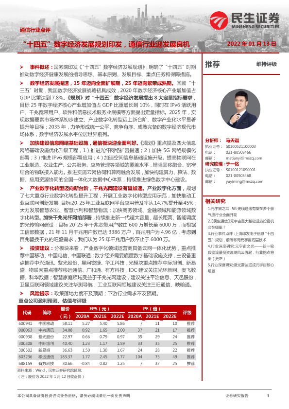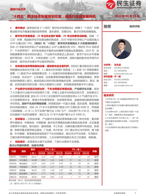 【民生证券】【20220113】通信行业点评:“十四五”数字经济发展规划印发,通信行业迎发展良机-2页
