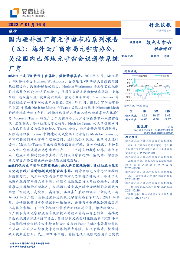 【安信证券】【20220116】国内硬科技厂商元宇宙布局系列报告(五):海外云厂商布局元宇宙办公,关注国内已落地元宇宙会议通信系统厂商-4页
