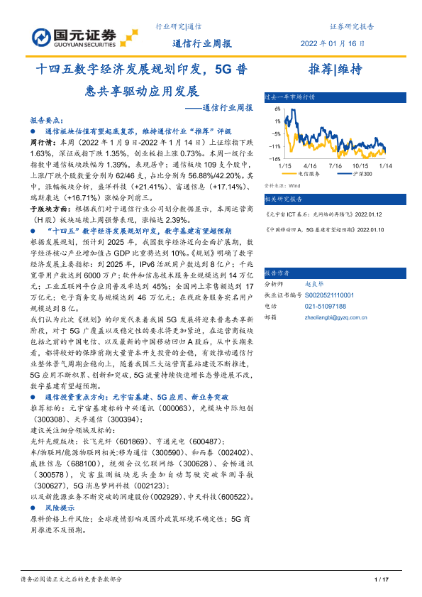 【国元证券】【20220116】20220116-国元证券-通信行业周报:十四五数字经济发展规划印发,5G普惠共享驱动应用发展-17页
