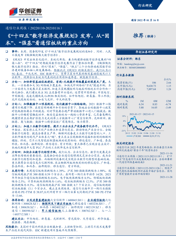 【华创证券】【20220116】通信行业周报:《“十四五”数字经济发展规划》发布,从“固本”、“强基”看通信板块的重点方向-19页