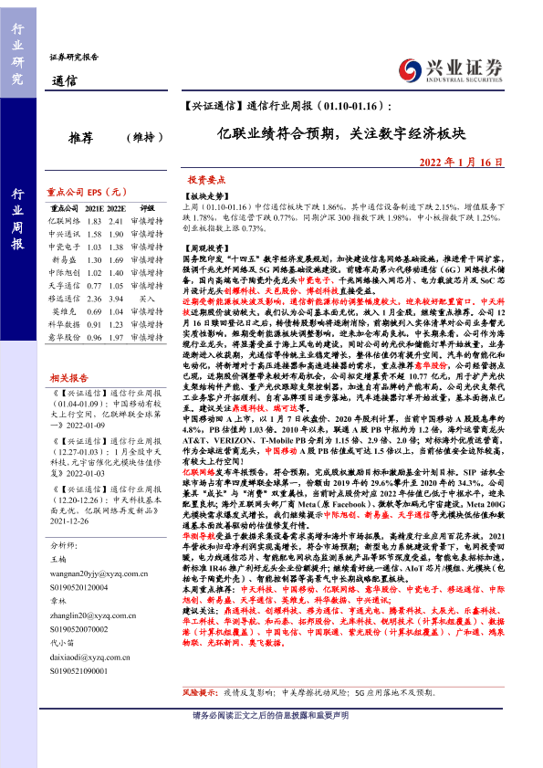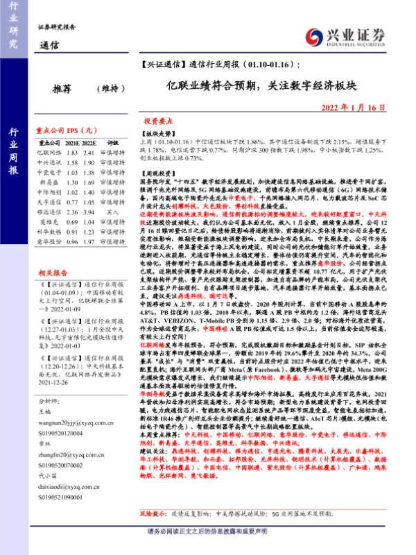 【兴业证券】【20220116】通信行业周报(01.10-01.16):亿联业绩符合预期,关注数字经济板块-29页