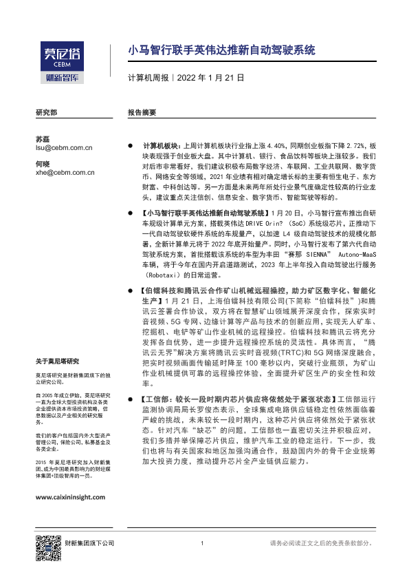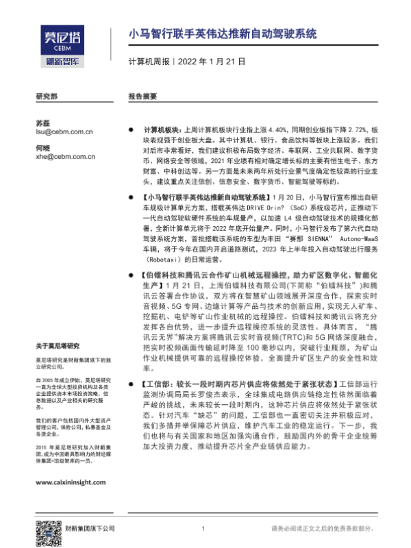【莫尼塔研究】【20220121】计算机周报:小马智行联手英伟达推新自动驾驶系统-7页
