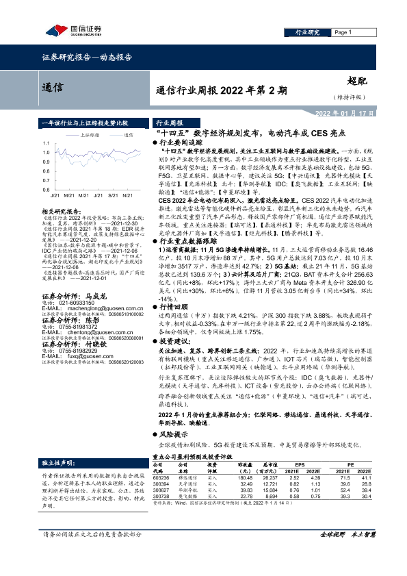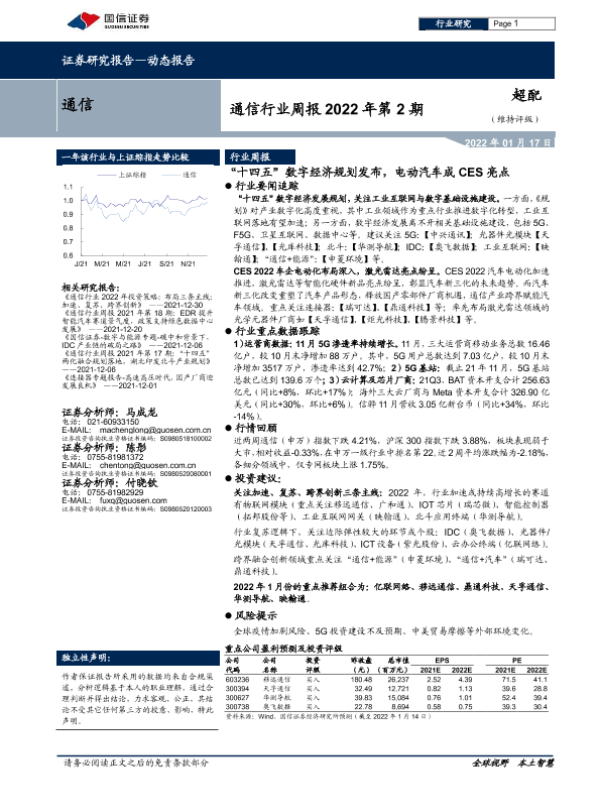 【国信证券】【20220117】通信行业周报2022年第2期:“十四五”数字经济规划发布,电动汽车成CES亮点-22页