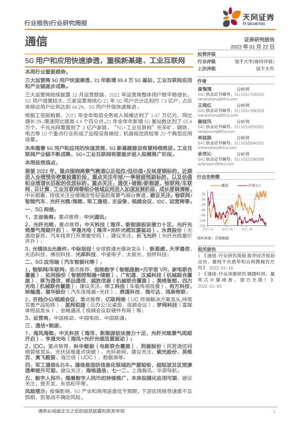【天风证券】【20220122】通信行业研究周报:5G用户和应用快速渗透,重视新基建、工业互联网-13页