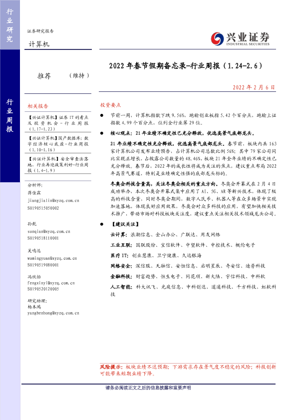 业绩预告 投资建议 春节假期 科技应用 计算机行业