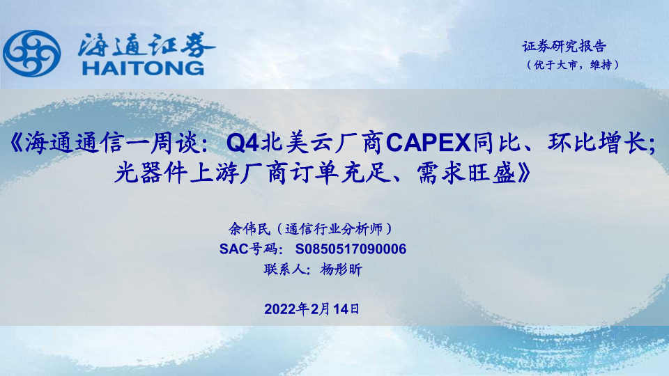 【海通证券】【20220214】海通通信一周谈:Q4北美云厂商CAPEX同比、环比增长;光器件上游厂商订单充足、需求旺盛-12页
