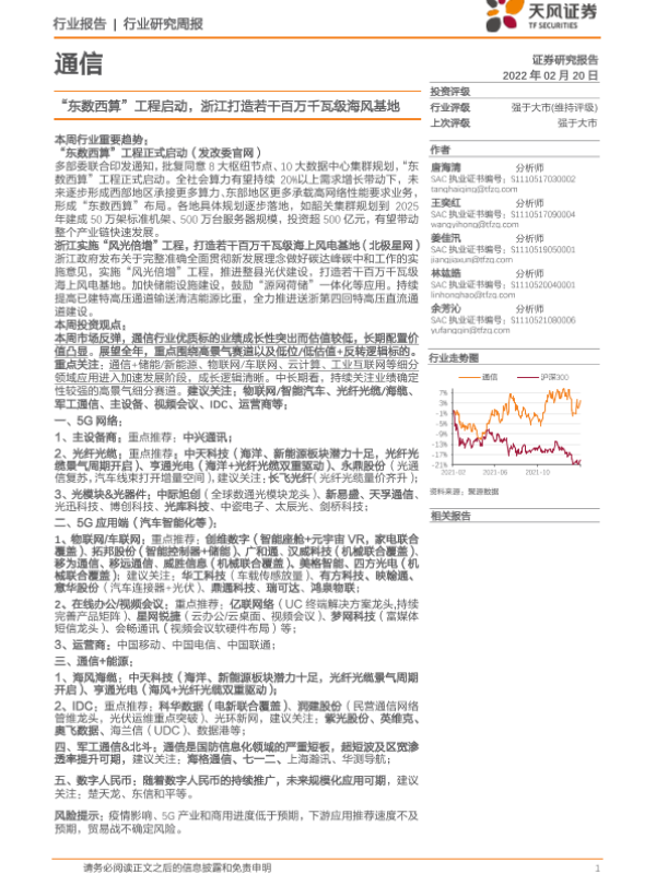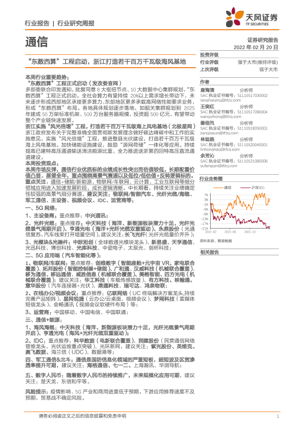 【天风证券】【20220220】20220220-天风证券-通信行业研究周报:“东数西算”工程启动,浙江打造若干百万千瓦级海风基地-11页