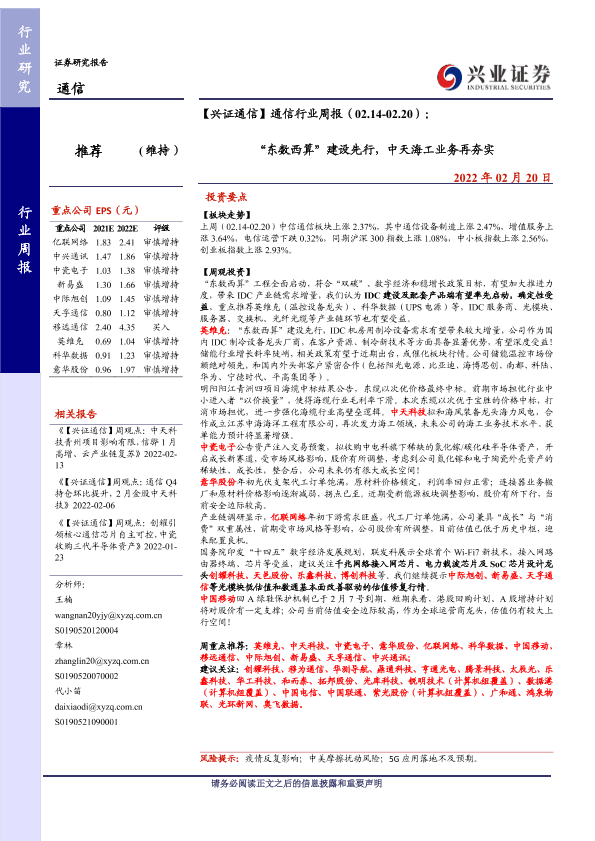 【兴业证券】【20220220】【兴证通信】通信行业周报(02.14-02.20):“东数西算”建设先行,中天海工业务再夯实-26页