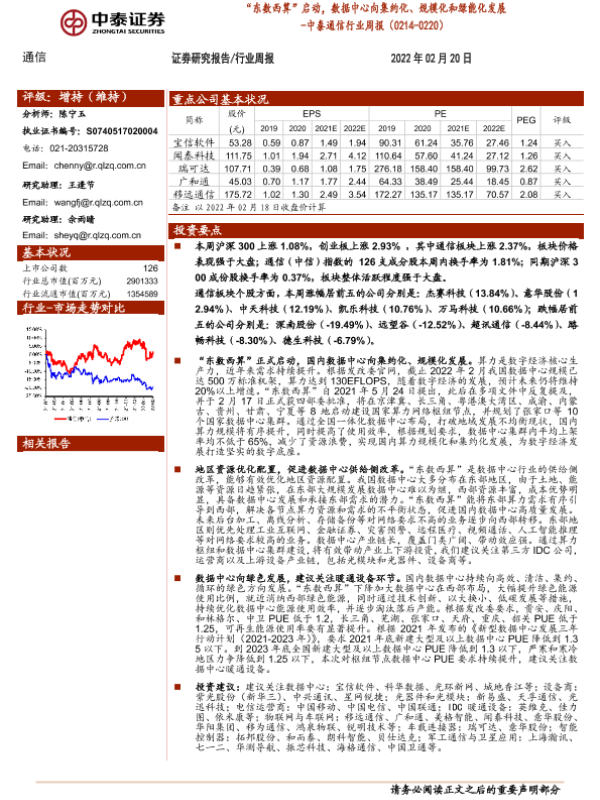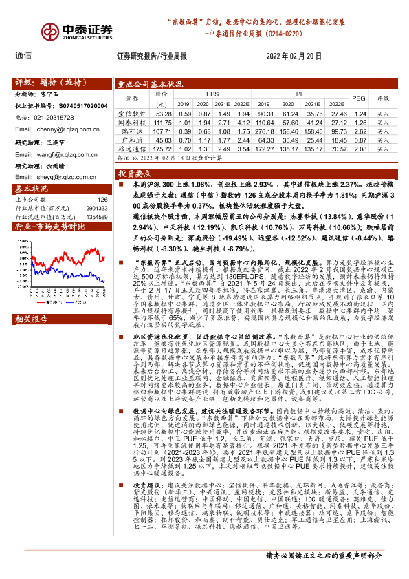 【中泰证券】【20220220】中泰通信行业周报:“东数西算”启动,数据中心向集约化、规模化和绿能化发展-12页
