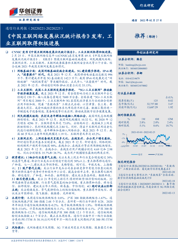 【华创证券】【20220227】通信行业周报:《中国互联网络发展状况统计报告》发布,工业互联网取得积极进展-20页