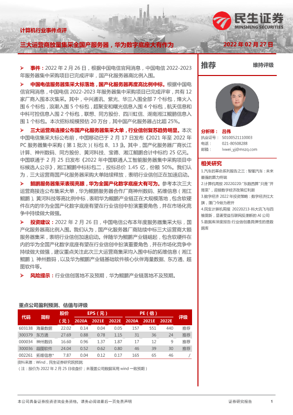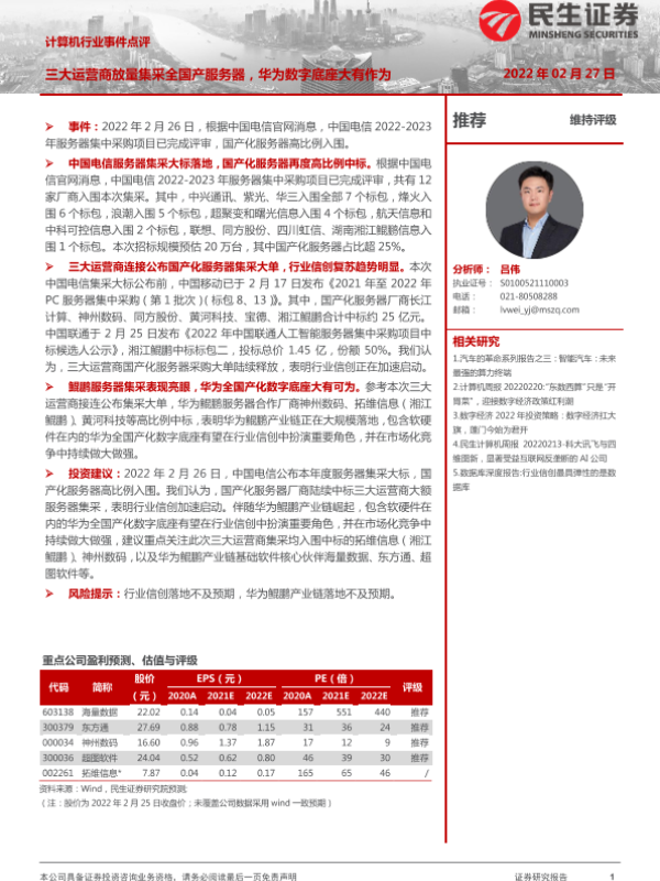 【民生证券】【20220227】计算机行业事件点评:三大运营商放量集采全国产服务器,华为数字底座大有作为-2页